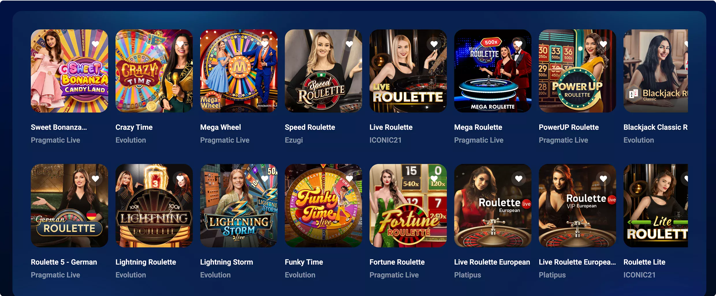 | Ruletka | Kilkadziesiąt wersji ruletki, opierających się na popularnych wariacjach (francuska, europejska, amerykańska). Rozgrywka odbywa się z wykorzystaniem automatycznego systemu losowania. | European Roulette, Roulette Touch |