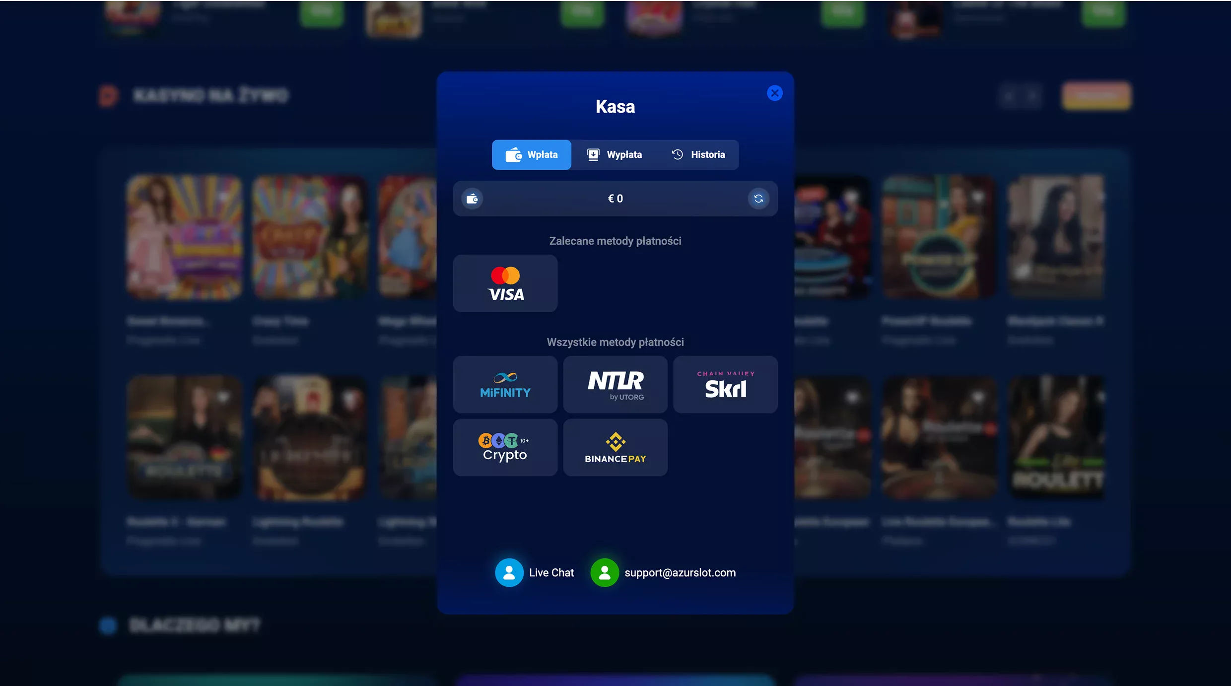 | Płatności | Blik, Visa, paysafecard, MiFinity, Neteller, Skrill, CASHlib, Binance Pay, kryptowaluty, przelew bankowy |