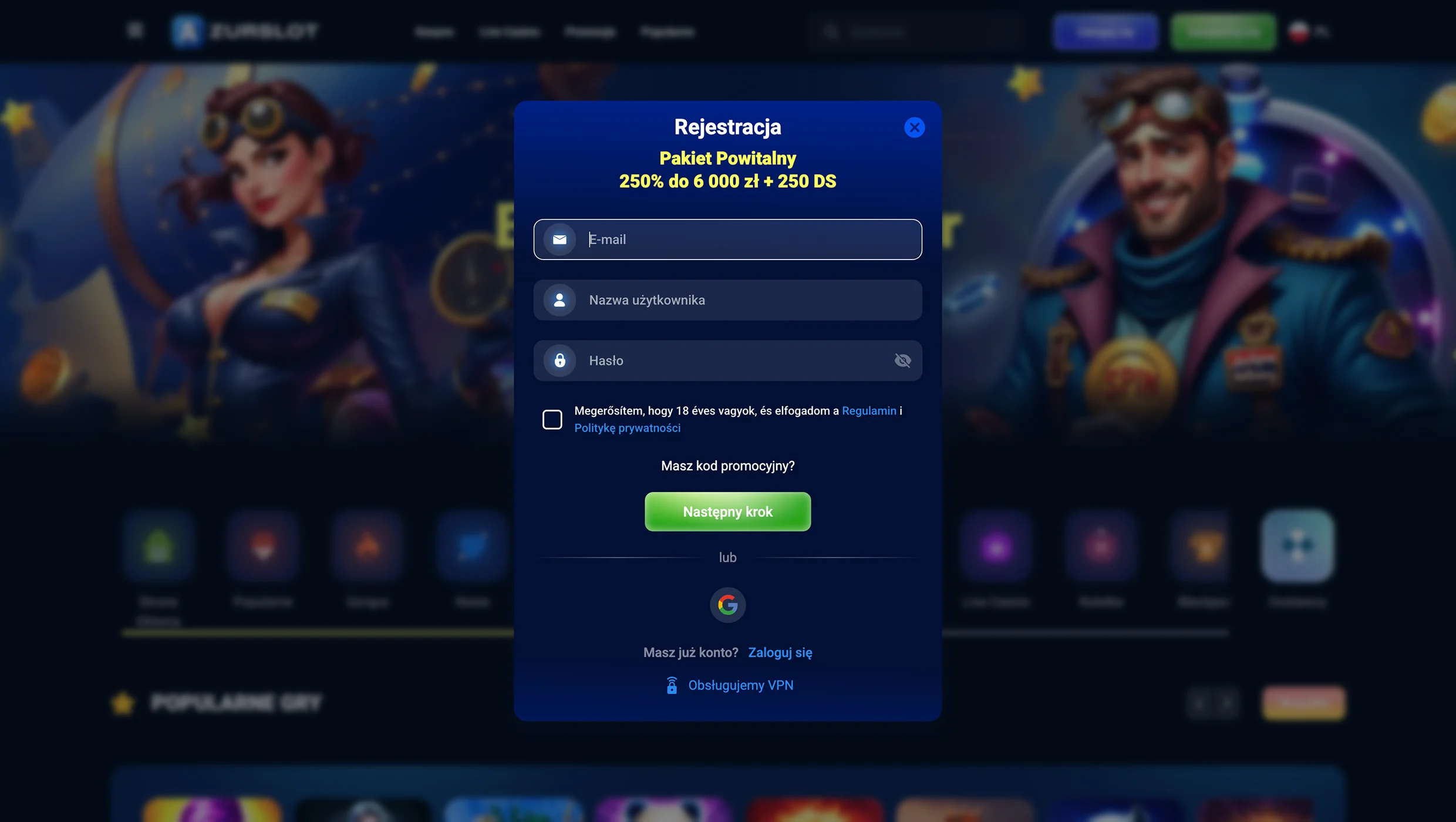 Przejdź na stronę Główną AzurSlot i rozpocznij proces zakładania konta: Kliknij przycisk „Zarejestruj się” i uzupełnij pierwszy formularz rejestracyjny. Wpisz adres e-mail, swoją nazwę użytkownika oraz hasło. Następnie zaznacz, że masz minimum 18 lat, znasz regulamin kasyna i kliknij „Następny krok”.