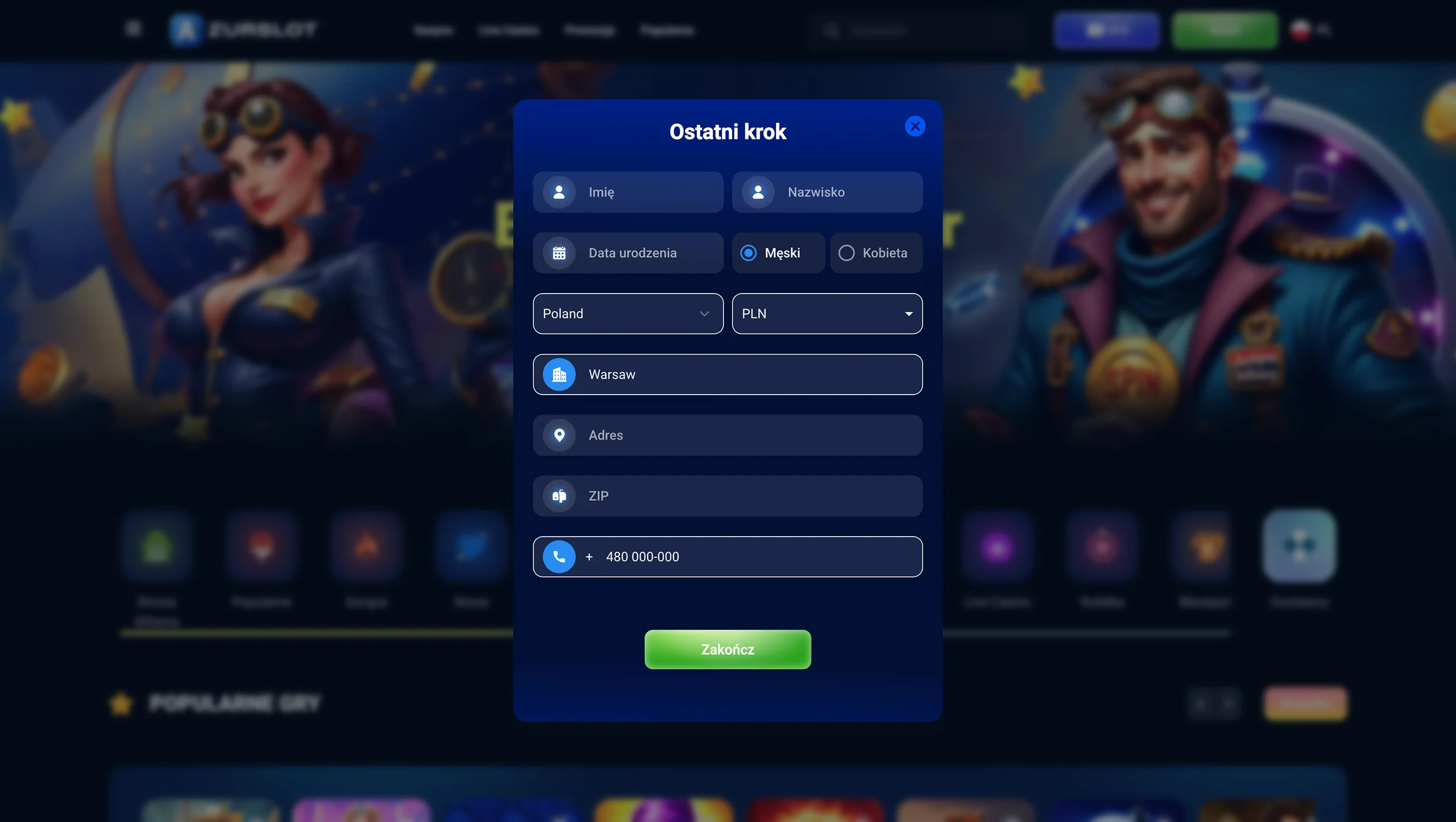Wypełnij formularz z danymi osobowymi: Podaj swoje imię i nazwisko oraz datę urodzenia. Wpisz datę urodzenia, wybierz płeć, kraj i walutę. Na koniec podaj dane adresowe i swój numer telefonu.