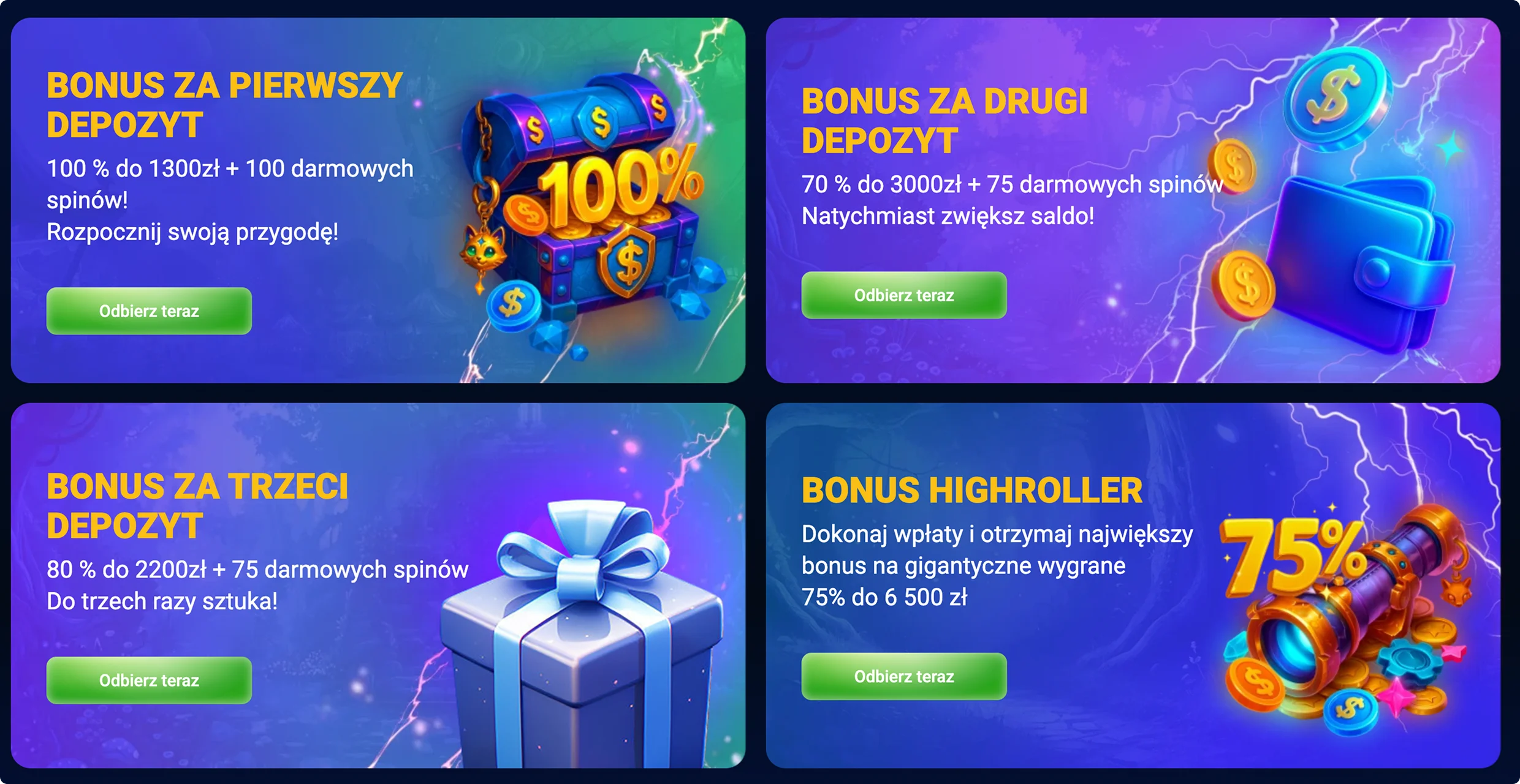 Jeżeli gracz może pozwolić sobie na jedną większą wpłatę, to otworzy się przed nim opcja skorzystania z ekskluzywnej oferty typu Highroller. W tym przypadku do odebrania jest jeden bonus depozytowy, wynoszący 75% do 6500 zł. Żeby móc z niego skorzystać, należy zdeponować minimum 1000 zł przy pierwszej wpłacie.